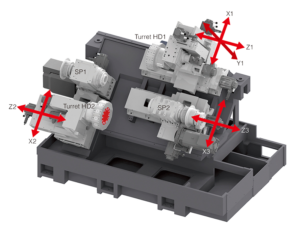 Performs simultaneous machining of holes on both ends and simultaneous machining with three tools using overlay control by adding the Y axis to the upper turret head (HD1) and the X3 axis to the auxiliary spindle (SP2).